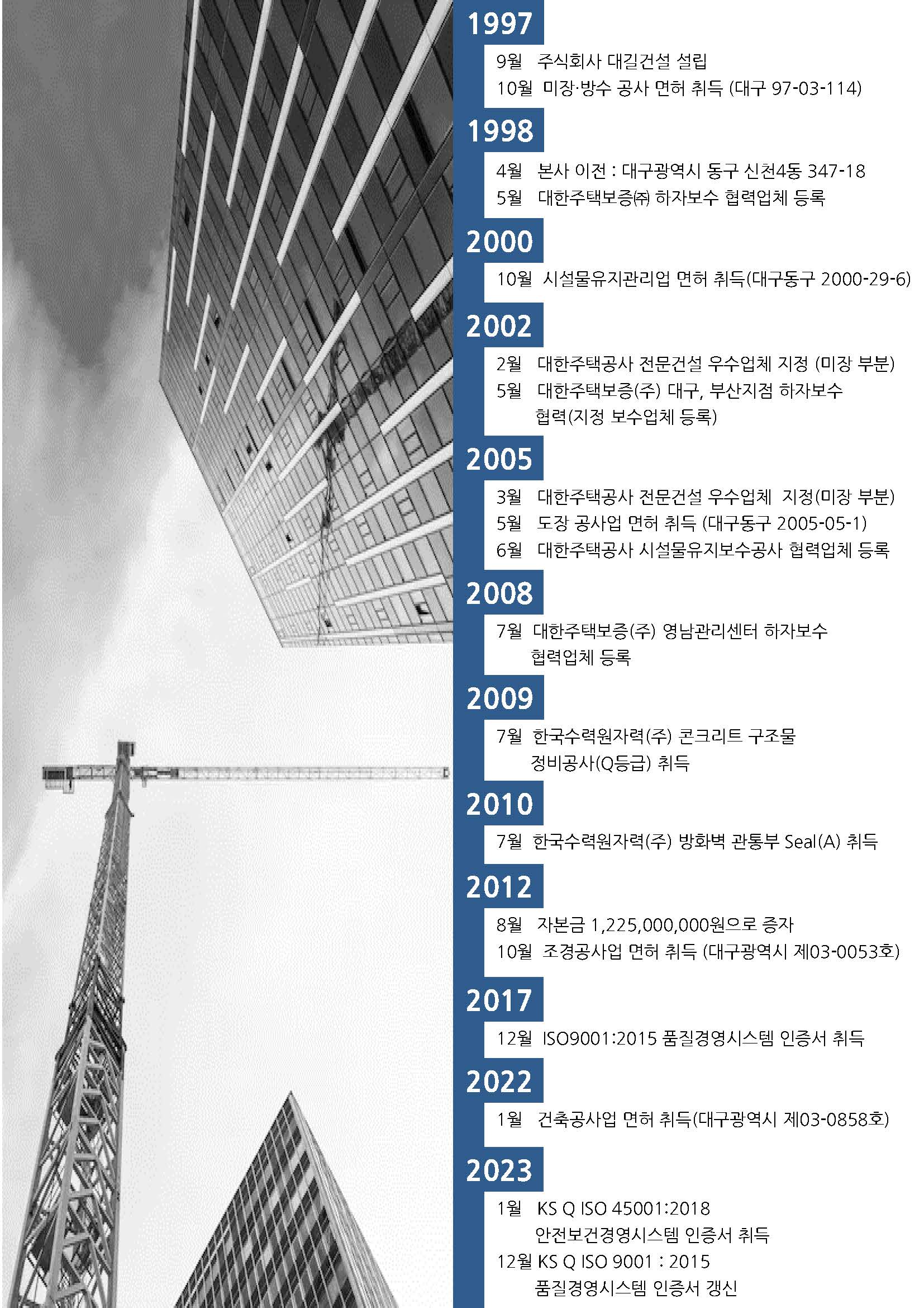저희 (주)대길건설은 1997년에 설립되어 현재까지 대구지역에서 꾸준히 성장과 발전을 계속하는 전문건설회사입니다. 설립 다음해인 1998년 부터 주택도시보증공사의 협력업체로 등록되어 매년 수천세대의 아파트하자보수공사를 시공하여 아파트 및 시설물 하자보수공사에 있어 기술력과 경쟁력을 갖춰왔습니다.