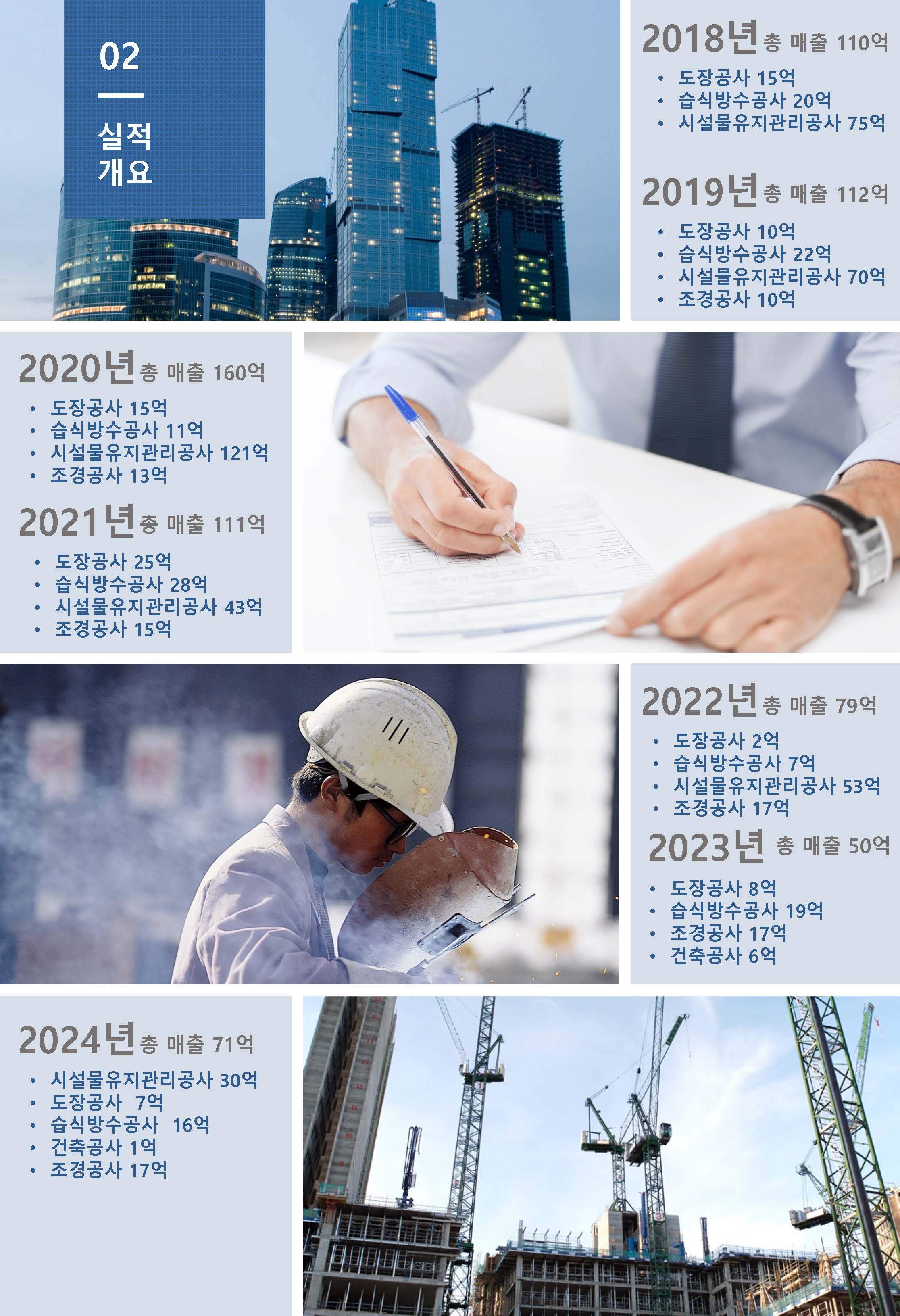 2022년부터 시행된 건설업면허 대업종 전환에 따라 시설물 보수공사 전문기술인력을 확보하고 건축공사업면허로 전환하여 건설사업체로서의 기술력과 경쟁력을 축적하고 있습니다.